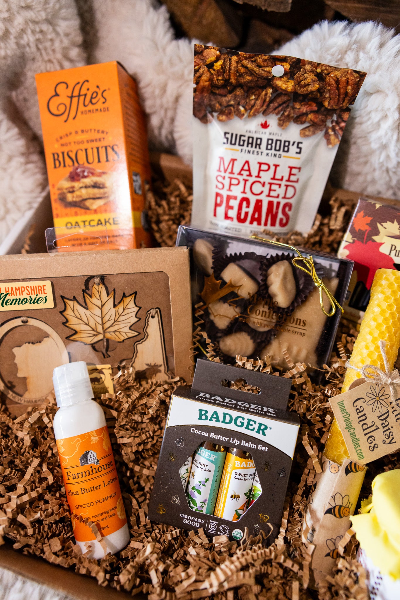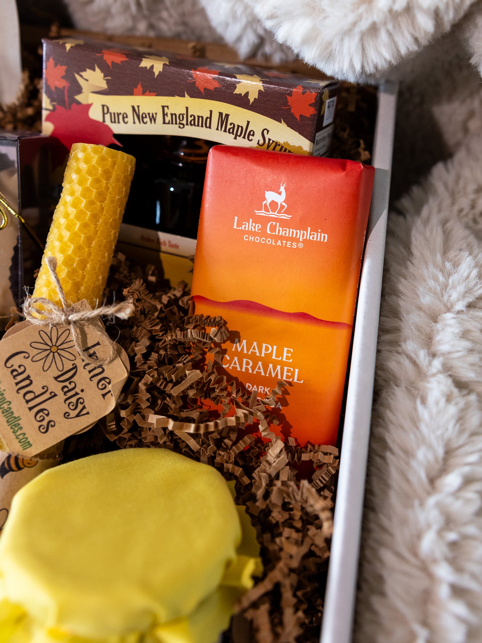 Featuring a cozy collection of locally made treasures and handcrafted favorites from small makers, including maple candy, spiced pecans, a pure beeswax candle, a maple syrup sampler, hand-carved wooden ornaments, and more. Thoughtfully packed and beautifully presented, it’s the perfect way to share gratitude, celebrate the season, or simply treat yourself.