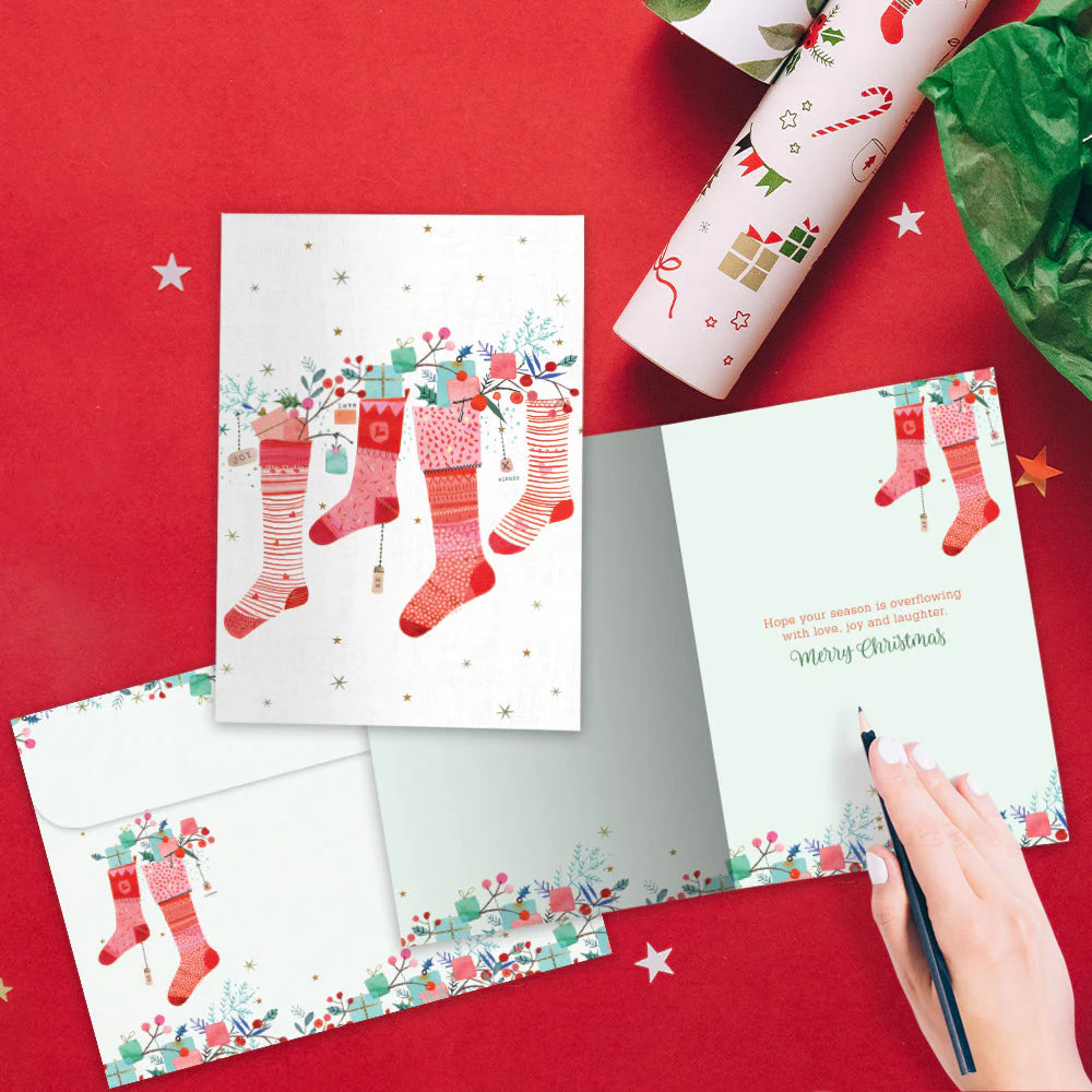This Christmas card set shares the message "Merry Christmas" on the cover, and on the inside reads "Hope your season is overflowing with love, joy and laughter". It features art by Lynn Horrabin and includes one 5 x 7 greeting card with a matching ARTvelope (all 5 x 7 envelopes are designed to match the greeting card cover art). Printing powered by solar energy. 100% Post-consumer recycled. Proudly Made in the USA